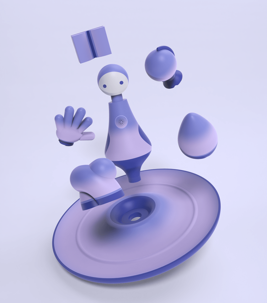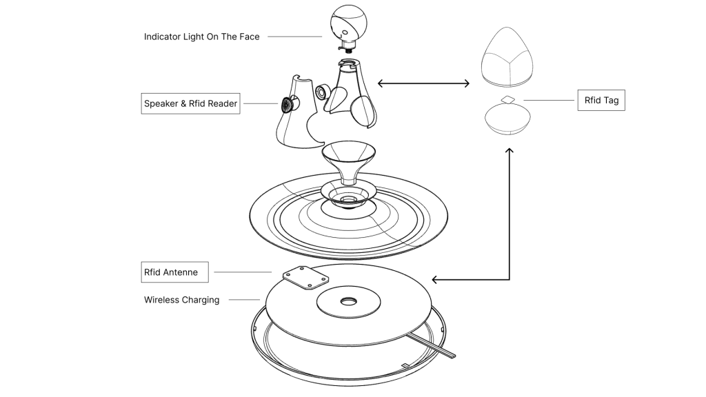 The product consists of several key components. The Doll Shape Speaker (Aka Luna) serves as the central hub, encouraging children’s conversations by acting as an agent that introduces life scenarios related to menstruation that children might find difficult to discuss. The Indicator Light shows the switching status of the device. The Audio Elements provide different sounds and knowledge related to the product, with each element offering unique content. Finally, the Tray holds the Speaker, Elementals, and integrates RFID technology components and batteries for the overall functionality of the product.