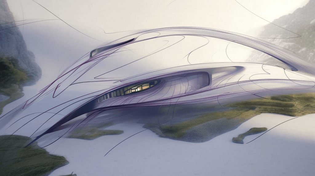 This architectural rendering depicts a stunningly unique and eco-friendly home made entirely out of recycled coffee grounds. The structure has a smooth and rounded shape, resembling an oversized egg or a large, polished stone. The exterior surroundings are the Arctic snowfields, the dark sky and the aurora borealis. in the style of organic forms, muted tones, terragen, smooth and curved lines. with a flat surface at the bottom, the bottom of the building overhanging, supported by many Wooden strips, On the sloping land halfway up the mountain. –ar 8:5